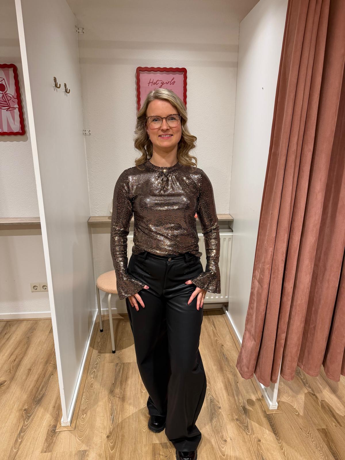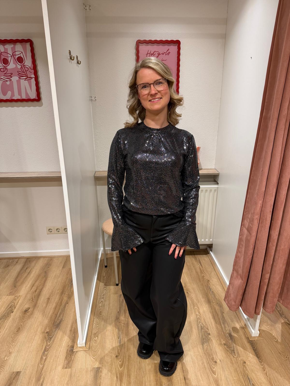 Deze prachtige glittertop is hét item voor een feestelijke, chique en opvallende look! De stof heeft een schitterende all-over sparkle die subtiel meebeweegt — perfect voor de feestdagen, etentjes of een avondje uit.